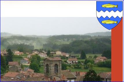 D'azur à la fasce vivrée d'argent accompagnée de deux truites d'or.