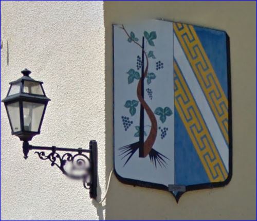 Parti: au 1er d'argent au cep de vigne au naturel sur un échalas de sable, au 2e d'azur à la bande d'argent côtoyée de deux cotices potencées contre-potencées d'or.
