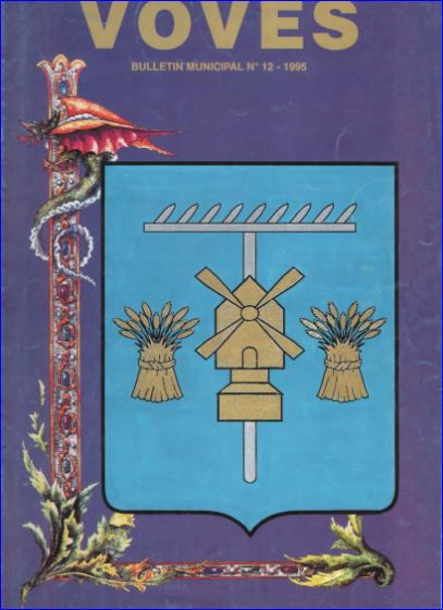 D'azur au râteau levé d'argent, au moulin à vent d'or brochant sur le manche, accosté de deux gerbes de blé du même.