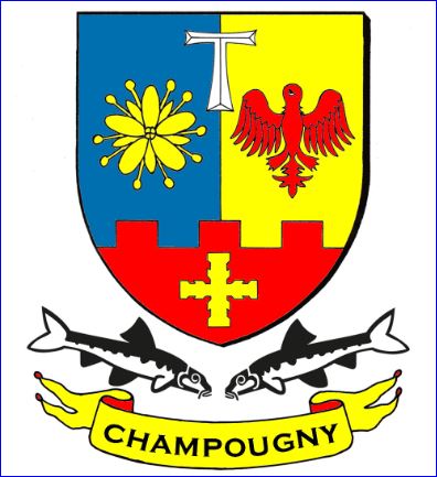 (2018) Parti: au 1er d'azur à la fleur de tilleul d'or, au 2e d'or à l'alérion de gueules; au tau d'argent brochant, en chef sur la partition; à la champagne de gueules crénelée de trois merlons et chargée d'une croisette écotée d'or.