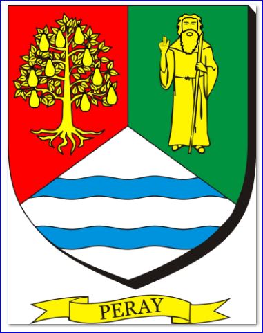 (2018) Tiercé en pairle renversé: au 1er de gueules au poirier d'or, au 2e de sinople à saint Jouin, ermite, d'or, au 3e d'argent à deux burelles ondées d'azur.