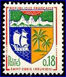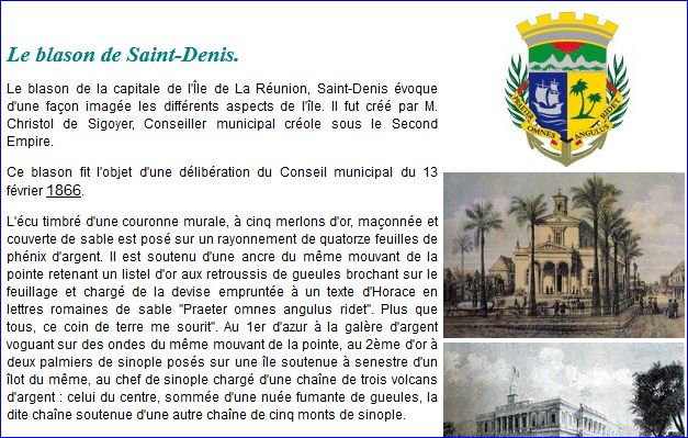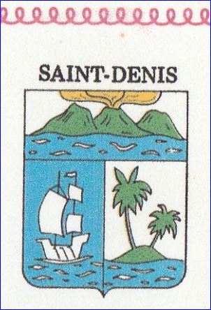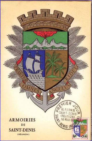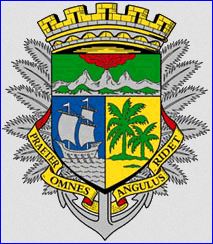 Parti: au 1er d'azur à la galère d'argent voguant sur une mer du même mouvant de la pointe, au 2e, d'or à deux palmiers de sinople posés sur une île soutenue à senestre d'un îlot du même; le tout sommé d'un chef de sinople chargé d'une chaîne de trois volcans d'argent, celui du centre, sommé d'une nuée fumante de gueules, ladite chaîne soutenue d'une autre chaîne de cinq monts de sinople.
