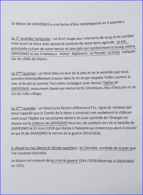 (2018) Parti: au 1er d'azur à l'église du lieu d'argent, au 2e d'or au château du lieu d'argent, à la colombe en vol du même brochant en chef sur la partition; le tout sommé d'un chef de gueules chargé de cinq épis de blés d'or, ceux des flancs plus petits, posés en bande à dextre et posés en barre à senestre.
