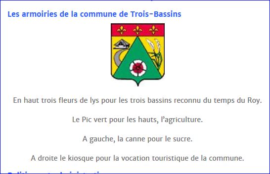 De sinople à la fleur d'hibiscus d'argent et de gueules, chapé d'or chargé à dextre d'un kiosque au naturel et au chemin semi circulaire du même mouvant du trait de partition et à senestre de deux brins de canne à sucre fleuris au naturel; le tout sommé d'un chef de gueules chargé de trois fleurs de lis d'or.