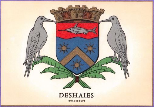 D'azur au chevron d'or accompagné de trois soleils non figurés du même; au chef ondé cousu de gueules chargé d'un espadon d'argent.