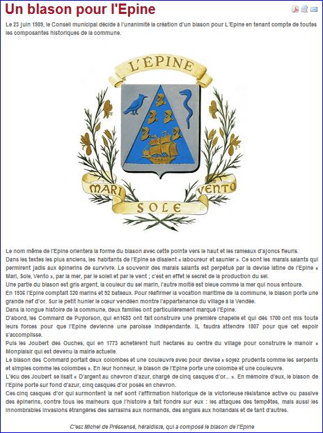 (1989) D'azur à navire d'or, le petit hunier chargé d'un coeur vendéen de gueules, voguant sur une mer d'argent, accompagnée de cinq heaumes d'or tarés de profil et ordonnés en chevron; chapé d'argent chargé en chef à dextre d'une colombe contournée d'azur et à senestre d'une couleuvre ondoyant en pal du même.