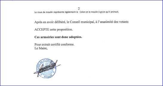 (2018) Coupé voûté: au 1er parti: au I d'or à la roue de moulin de gueules et au bourdon croiseté d’argent brochant, au II de gueules au bouquet de trois épis de blé d'or liés du même, au 2e de sinople à la fleur d'aubépine d'argent au bouton étoilé d'or entouré de dix losanges de gueules.