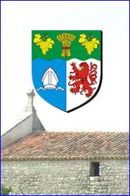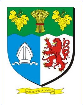 Parti: au 1er d'azur à la mitre d'argent, au 2e d'argent au lion de gueules, armé et lampassé d'or; le tout sommé d'un chef ondé de sinople chargé d'une gerbe de blé d'or liée de gueules et accotée de deux grappes de raisins tigées et feuillées d'or.