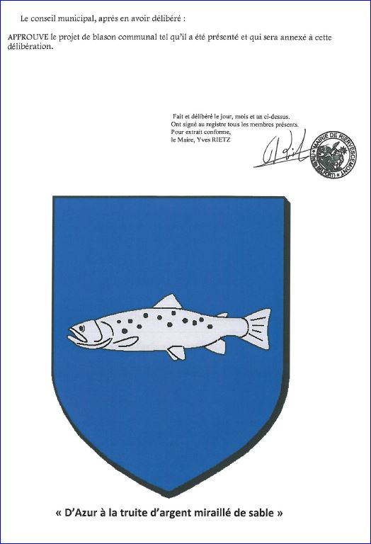 (2018) D'azur à la truite d'argent miraillée de sable.
