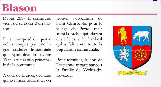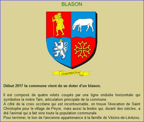 (2017) Écartelé, le trait du coupé ondé: au 1er de gueules à saint Christophe d'or portant l'enfant Jésus du même, au 2e d'azur à la brebis paissant d'argent, au 3e d'azur au lion d'argent, couronné d'or, armé et lampassé de gueules, au 4e de gueules à la croix cléchée, vidée et pommetée de douze pièces d'or.