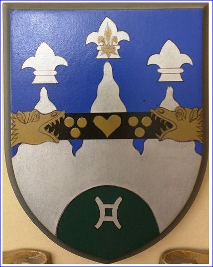 Coupé émanché ondé de deux pièces et deux demies d'azur sur trois pièces d'argent, celle du milieu plus élevée, chaque émanche d'argent surmontée d'une fleur de lis au pied nourri du même, celle du chef surchargée d'une fleur de lis d'or, l'argent chargé d'un tunnel de sinople mouvant de la pointe surchargé d'un fer de moulin d'argent; à deux têtes de dragon affrontées d'or mouvant des flancs et engoulant une divise de sable chargée d'un coeur d'or accosté de six besants du même ordonnés 2 et 1 de chaque côté, le tout brochant.