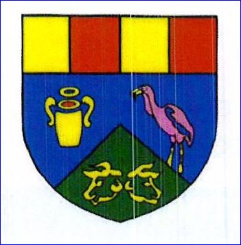 De sinople à deux têtes coupées de boeufs adossées d'or et ombrées du champ; mantelé cousu d'azur chargé, à dextre, d'une urne à deux anses d'or, cerclé du champ, ouvert de gueules et surmonté d'un couvercle ovale d'or rempli de sinople, et, à senestre d'un ibis rouge au naturel, becqué et membre d'or, mouvant du trait de partition; le tout sommé d'un chef palé d'or et de gueules de quatre pièces