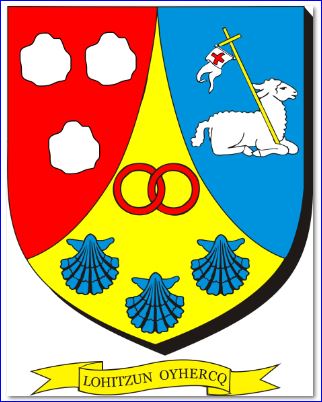 (2017) D'or à trois coquilles d'azur, 2 et 1, surmontées de deux annelets de gueules entrelacés en fasce; chapé ployé, à dextre de gueules à trois cailloux d'argent et à senestre d'azur à l'agneau pascal couché et contourné d'argent, portant une croix haute d'or au guidon d'argent chargé d'une croisette de gueules.