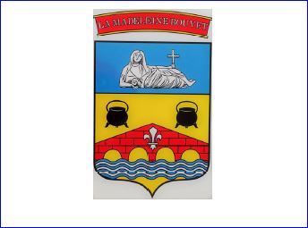 (2011) D'or au pont en dos d'âne de quatre arches de gueules, maçonné de sable, mouvant des flancs, chargé en son centre d'une fleur de lis d'argent, posé sur une rivière fascée ondée d'azur et d'argent de sept pièces et accompagné en chef de deux chaudrons de sable; au chef d'azur chargé de sainte Madeleine du lieu allongée d'argent.