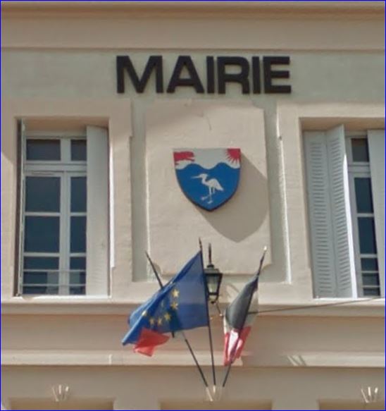 D'azur au héron d'argent; au chef ondé du même chargé d'un ours passant et contourné de gueules mouvant du flanc dextre et d'un soleil couchant non figuré du même.