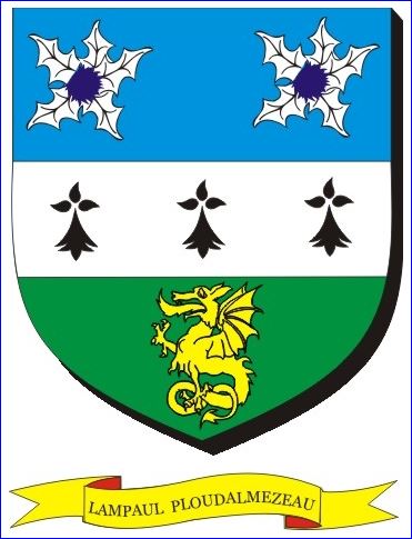 Tiercé en fasce: au 1er d'azur à deux fleurs de panicaut maritime [chardon bleu, Eryngium maritinum] au naturel, au 2e d'argent chargée de trois mouchetures d'hermine de sable, au 3e de sinople au dragon d'or.T