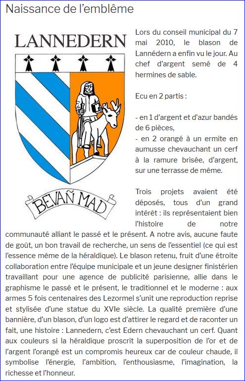 (2010) Parti: au 1er bandé d'argent et d'azur, au 2e d'orangé à l'ermite en aumusse chevauchant un cerf à la ramure brisée, le tout d’argent, sur un socle du même; le tout sommé d'un comble d'argent chargé de quatre mouchetures d'hermine de sable.