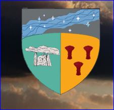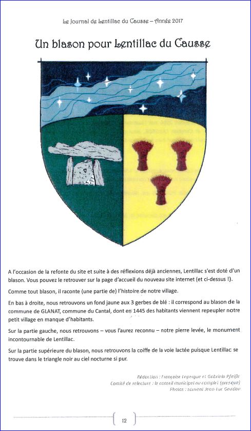 (2016) Parti: au 1er de sinople au dolmen du lieu dit "La Pierre Levée" d'argent, au 2e d'or à trois gerbes de blé de gueules; au chef voûté de sable chargé d'une représentation de la Voie Lactée d'azur posée en bande et chargé d'étoiles à quatre rais d'argent brochant en nombre.
