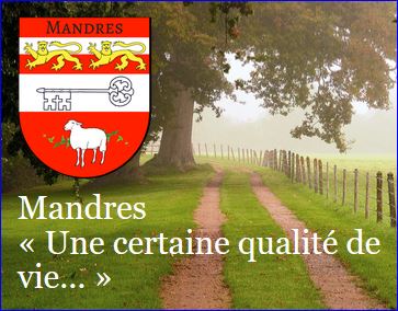 De gueules à la fasce d'argent, chargée d'une clé au trait de sable, posée en fasce, accompagnée en chef d'une divise du même, celle-ci surmontée de l'inscription « MANDRES » de sable et soutenue de deux léopards d'or brochant en partie sur la divise, la fasce accompagnée en pointe d'un mouton arrêté d'argent brochant sur une branche de lierre de sinople posée en fasce.