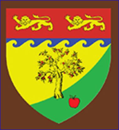 Taillé ployé d'or et de sinople; au pommier coupé d'or et fruité de gueules brochant sur le tout senestré en pointe d'une pomme de gueules, feuillée de sinople et chargeant le sinople; au chef de gueules chargé de deux léopards d'or et soutenu d'une trangle, la ligne inférieure formée de six vaguelettes, d'azur.