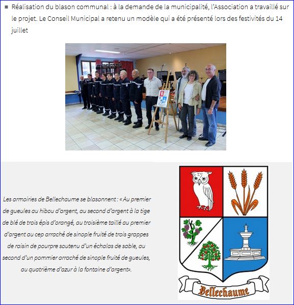 (2016) Écartelé: au 1er de gueules au hibou d'argent, au 2e d'argent à trois épis de blé,tigés, feuillés et empoignés d'orangé, au 3e taillé au I d'argent au cep de vigne de sinople, fruité de pourpre et tuteuré d'un échalas de sable et au II d'argent au pommier de sinople fruité de gueules, au 4e d'azur à la fontaine monumentale d'argent.