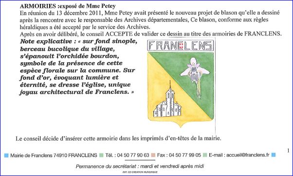 (2012) Tranché: au 1er de sinople à la fleur d'orchidée bourdon [Ophrys fuciflora] au naturel, au 2e d'or à l'église du lieu d'argent.