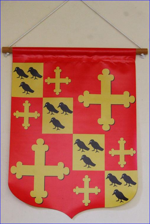Écartelé: aux 1er et 4e contre-écartelé aux I et IV d'or à trois corneilles de sable, aux II et III de gueules à la croix tréflée d'or, aux 2e et 3e de gueules à la croix tréflée d'or.