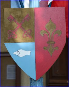 Parti: au 1er coupé au I d'or à deux clés de gueules passées en sautoir, au II d'azur au poisson d'argent, au 2e de gueules à la fleur de lis d'or.