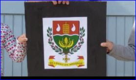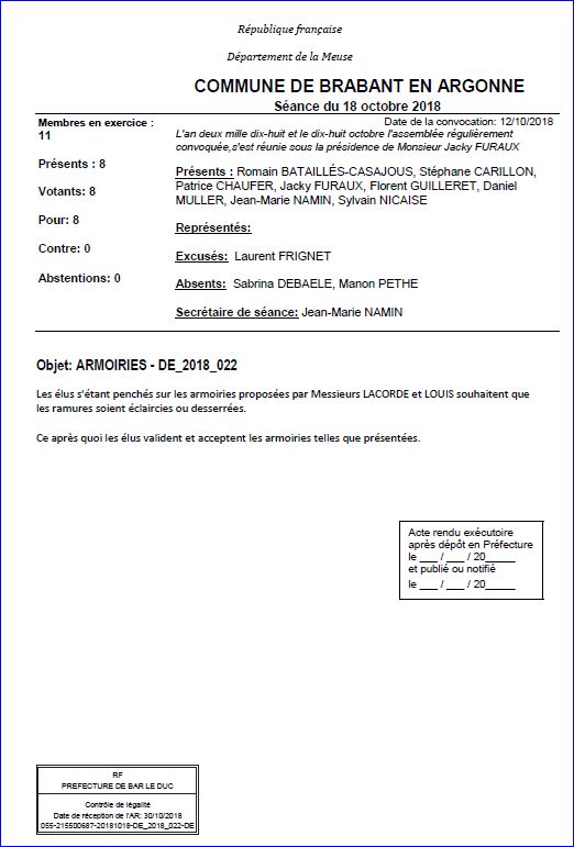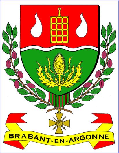 (2018) Coupé ondé: au 1er de gueules au gril d'or, la poignée en haut, accosté de deux gouttes d'argent, au 2e de sinople à la cardère [Dipsacus fullonum] d'or; à la trangle ondée en filet d'argent brochant sur la partition.
