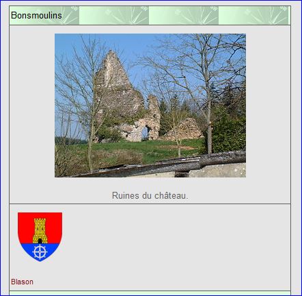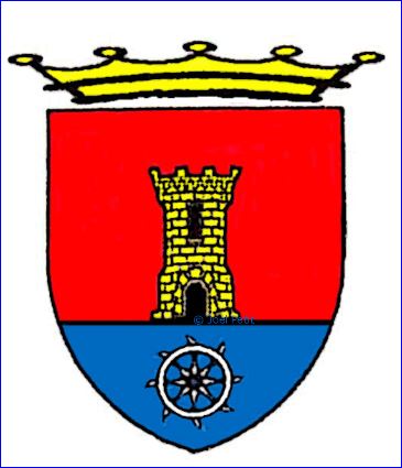 De gueules à la tour d'or ouverte, ajourée et maçonnée de sable, posée sur une champagne cousue d'azur chargée d'une roue de moulin d'argent.