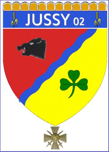 Explications: tête de sanglier et trèfle, emblèmes des seigneurs du Moyen Âge, la bande bleue transversale pour signifier le canal qui traverse la commune, les épis pour les quinze agriculteurs exploitant les terres de notre territoire, les douze créneaux correspondent aux douze bords du biscuits LU en rapport avec l’usine LU qui est implantée à JUSSY (Cf. significations de ce biscuit LU, très intéressantes à découvrir: par ex. les douze créneaux correspondent aux douze mois de l’année, les quatre coins aux quatre saisons… etc.), et enfin la Croix de Guerre qui a été décernée à la Commune suite à sa destruction totale en 1917 par les Allemands.