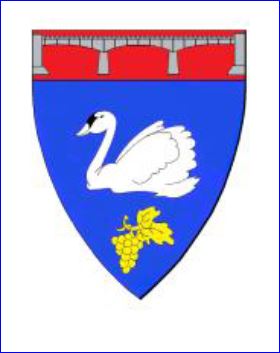 D'azur au cygne nageant d'argent accompagné en pointe d'une grappe de raisin tigée et feuillée d'or; au chef cousu de gueules chargé d'un pont droit du lieu de trois arches d'argent.