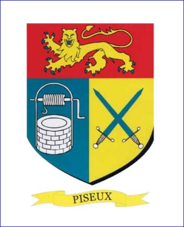 Parti: au 1er d'azur au puits d'argent maçonné de sable, au 2e d'or à deux épées d'azur, garnies d'argent et passées en sautoir; le tout sommé d'un chef de gueules au léopard d'or armé et lampassé d'azur.