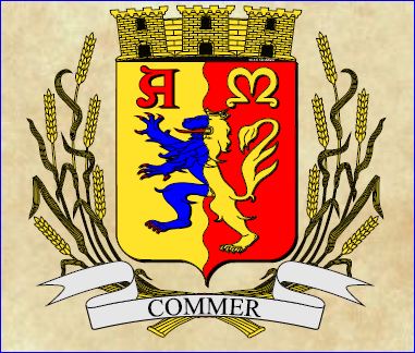 (2018) Mi-parti ondé: au 1er d'or a lion d’azur, armé et lampassé de gueules surmonté à dextre de la lettre onciale A du même, au 2e de gueules au lion couronné d’or surmonté à senestre le la lettre onciale M du même.