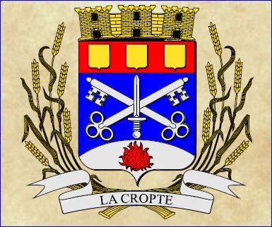 (2018) D'azur à deux clés passées en sautoir et au glaive brochant en pal, le tout d'argent; au coupeau du même chargé d'un feu de gueules; au chef cousu de gueules, chargé de trois écus d'or.