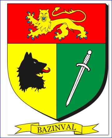 (2018) Parti: au 1er d'or à la tête de loup contournée de sable lampassée de gueules, au 2e de sinople à l'épée d'argent versée en barre; le tout sommé d'un chef de gueules au léopard d'or armé et lampassé d'azur.