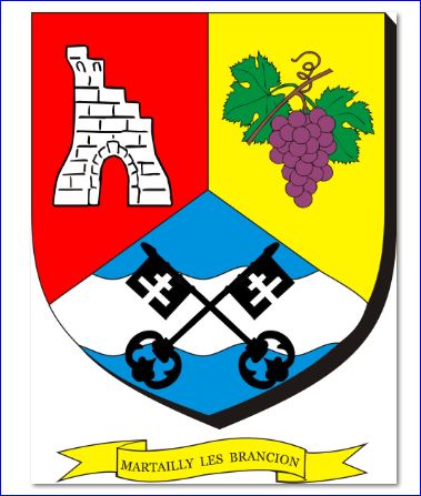 Tiercé en pairle renversé: au 1er de gueules à la tour ruinée d'argent, ouverte du champ et maçonnée de sable, au 2e d'or à la grappe de raisin feuillée de deux pièces au naturel, au 3e d'azur à la fasce ondée d'argent et à deux clefs de sable passées en sautoir brochant sur la fasce.