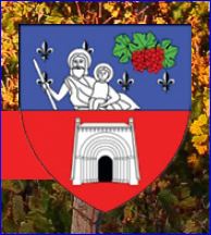 Coupé: au 1er d'azur à six fleurs de lis d'argent, deux en chef à dextre, et quatre en points rangées en fasce, à la grappe de raisin de gueules feuillée de sinople en chef à senestre, à saint Christophe portant l'enfant Jésus, d'argent, mouvant du trait du coupé et brochant, au 2e de gueules au portail de l'église du lieu d'argent ouvert de sable.