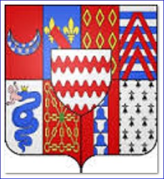 Parti de trois, coupé de un,: au 1er de gueules au croissant de vair, au 2e d'azur à trois fleurs de lis d'or et au bâton de gueules péri en bande, brochant, au 3e de gueules à neuf mâcles d'or, 3, 3 et 3, au 4e burelé d'argent et d'azur à trois chevrons de gueules, le 1er écimé, au 5e d'argent à la guivre d'azur, couronnée d'or, à l'issant de carnation, au 6e de gueules aux chaînes d'or passées en croix, sautoir et orle, chargées en coeur d'une émeraude de sinople, au 7e de gueules au pal de vair, au 8e d'hermine plain; sur le tout, fascé ondé enté d'argent et de gueules.