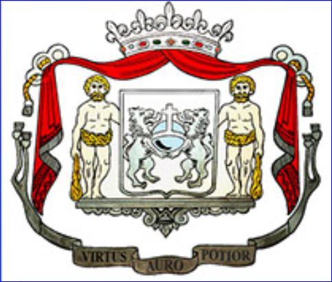 D'or à deux lions affrontés d'azur tenant un monde du même, cintré et croiseté du champ.