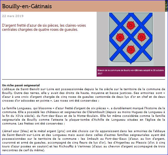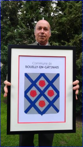 (2017) D'argent fretté d'azur de six pièces, les claires-voies centrales chargées de quatre roses de gueules.