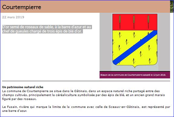 (2018) D'or semé de roseaux de sable, à la barre d'azur et au chef de gueules chargé de trois épis de blé d'or.