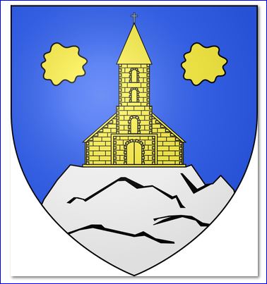 D'azur à l'église d'or sur une montagne d'argent mouvant de la pointe, accostée en chef de deux cailloux d'or.