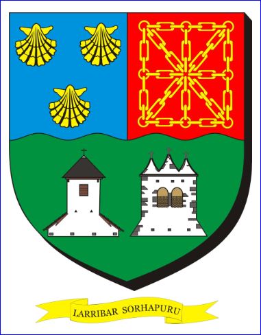 (2016) Coupé ondé: au 1er parti au I d'azur aux trois coquilles d'or, au II de gueules aux chaînes d'or posées en pal, fasce, sautoir et orle, au 2e de sinople au clocher l'église de l'Assomption du lieu à dextre et au clocher de l'église saint Martin du lieu à senestre, le tout au naturel.