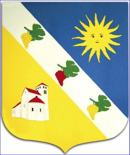 Tranché: au 1er d'azur au soleil d'or, au 2e d'or à l'église du lieu d'argent, ajourée de sable et essorée de gueules; à la bande d'argent chargée de trois grappes de raisin, d'or en chef et en pointe, de gueules en coeur, toutes trois feuillées d'une pièce de sinople, brochant sur la partition.