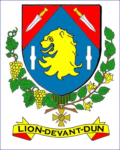 (2019) D'azur à la tête de lion d'or accostée de deux vergettes alésées et nouées d'argent; chaperonné cousu de gueules à deux poignards romains [pugios] d'argent garnis d'or, abaissés et posés celui de dextre en barre, celui de senestre en bande.
