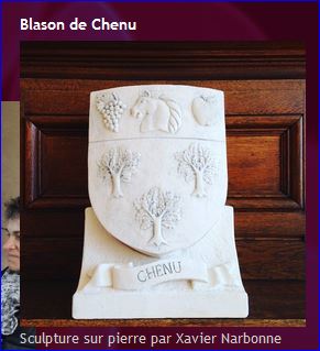 D'or à trois chênes de sinople; au chef de gueules chargé d'une tête de cheval accostée, à dextre, d'une grappe de raisin feuillée d'une pièce et, à senestre, d'une pomme feuillée d'une pièce, le tout d'argent.