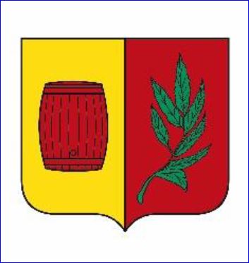 Parti: au 1er d'ors au tonneau de gueules posé en pal, au n2e de gueules à la branche de saule de sinople.