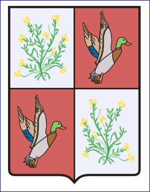 Écartelé: aux 1er et 4e d'argent à la plante de sinople fleurie d'or, aux 2e et 3e de gueules au canard colvert contourné, essorant, au naturel.