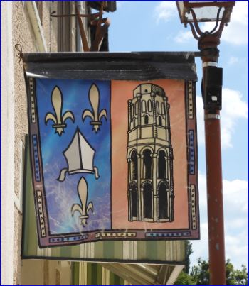 D'azur à la mitre d'argent accompagnée de trois fleurs de lis d'or.